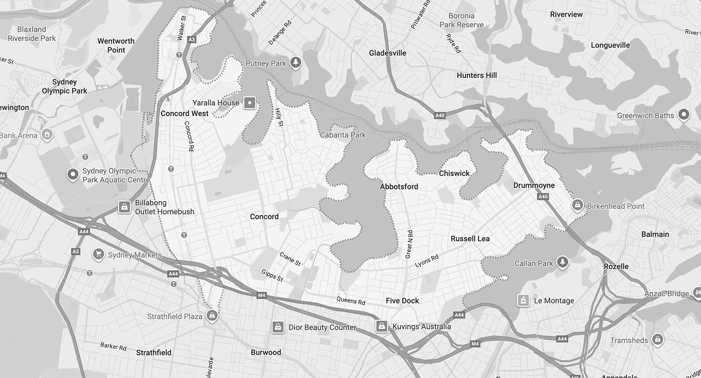 Suburbs include Concord, Five Dock, Drummoyne, Rhodes, Breakfast Point, and Abbotsford.